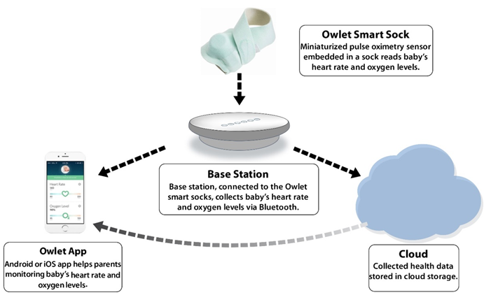 In 2013, Owlet Baby Care was founded to offer products to simplify parenthood. The Owlet baby monitor is a technology comprises of a soft Smart Sock and a base station. Pulse oximetry sensor, hospital-grade noninvasive technology, embedded on the Smart Sock that fits snugly on baby's foot to monitor their heart rate and oxygen levels during sleeping.30 Bluetooth technology is used to connect the Smart Sock to the base station and the base station to the smartphones or other devices. The sensor attached to a specially designed Smart Sock collects and sends vital health signs to the base station. Then, the information directly communicates to connected smartphones and the internet cloud. The base station glows green which represents everything is okay i.e. heart rate (60-220 BPM) and oxygen levels (≥95) are within the normal range. However, in any event, when a baby's heart rate or oxygen levels falls too low or high, the alarm on the base station will go off with flashing red light and app notification to parents' cellphones (Figure 3). Owlet baby monitor helps parents anxiety-free sound sleep who is worried about the frightening possibility of sudden infant death.13 The convenient design feature of the sock is easily adjustable and can fit easily to infants from 0-18 months. Socks are manufactured by interlocking, a process of weft knitting,31 comb yarns which are made of finer, smoother, cleaner, soft, and strong fibers. The high hairiness of the combed yarn32,33 assures comfort to the baby's foot. Furthermore, cotton fibers' additional property of sweat absorbency,34 breathability, and heat-retention provide the desired comfort35 to the baby during prolonged use. In 2016, Owlet sold 150,000 units of smart socks, which generated $19 million in revenue.13 A recent study on 47,495 Owlet users has reported 96% of the parents felt less anxious and 94% expressed better sleep quality during the use of Owlet Smart Sock.8 However, a large number of parents have also reported on parent enhanced anxiety due to frequent false alarm, app crashing, data security, and real-time data transmission.