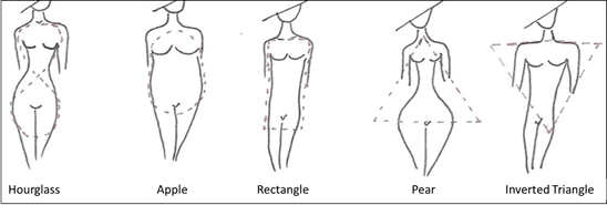 Based on these results, it was possible to select which students would participate in the second phase of the research, since the determination of the biotype is of extreme relevance in the choice of the pant models to be produced in order to attend to the corporeal dimensions of the users. The intention in considering this variable was to know the biotype of the users who would wear the jeans and carry out the evaluations. The shapes of women’s bodies represented in the questionnaire were based on the study by Vuruskan & Bulgun,31 and are shown in Figure 1.