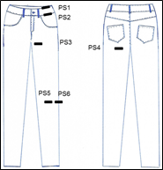 The pressure sensors were placed in regions of the body where the jeans usually applied high pressure. These regions were defined based on questioning done with the 136 female students during the first phase of this research. These locations were positioned at the upper (PS1) and lower (PS2) waist, front (PS3) and rear of the thigh (PS4) and front (PS5) and side of the knee (PS6) (Figure 5).