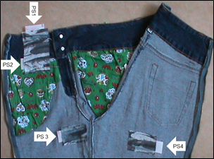In order to avoid interfering with the wearer's sensitivity and the elasticity of each pair of jeans, a thin and smooth mesh fabric was used. This fabric was sewn on the pants so that the sensors could be fitted between the jeans and this fabric, in positions PS 1, PS 2, PS 3 and PS 4 (Figure 6). The stitching of the fabric on the jeans was performed manually with long stitches and no lashing at the beginning and at the end of the seam to avoid interfering with the elasticity of the pant fabric.