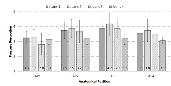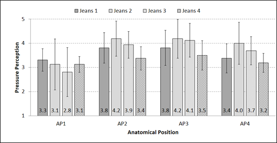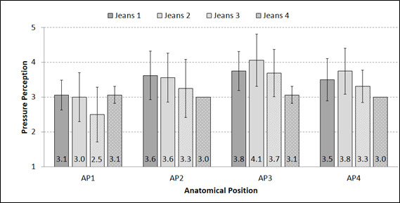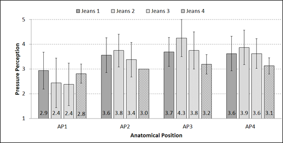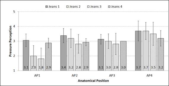 Figure 9 Perceived pressure by wearers in the waist region of each pair of jeans at different anatomical positions (AP). The pressure perception in the y-axis is 1-very loose, 2-loose, 3-comfortable, 4-tight and 5-very-tight.