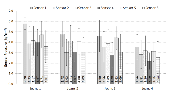 Sensor 1, positioned at the top of the waistband (Figure 5, PS1), stood out as the one with the highest pressure and the highest pressure and widest range of pressures in all tested jeans, ranging from 3.5kg/cm² in jeans 4 to 5.7kg/cm² in jeans 1 (Figure 14). Half of this sensor was positioned under the pants and half past the waistband; thus, the recording occurred at the end of the fabric. Normally, in this position, the existing pressure can be easily perceived. In addition, this process facilitates standardization at the place of positioning between the pants and the user, because regardless of the user's biotype that influenced the position of the other sensors, this sensor always remained at the end of the tissue with a portion below the tissue.