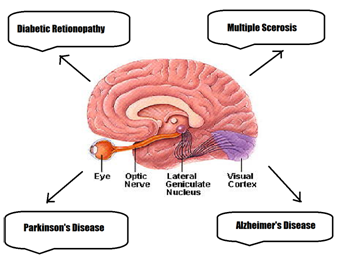 There are different neurological diseases that may cause degradation of retina. Most common of them are Diabetic Retinopathy (DR), Multiple Sclerosis (MS), Parkinson’s disease (PD) and Alzheimer’s disease (AD). The increasing prevalence of diabetes and its associated eye diseases like DR, cause blindness in patients younger than age 65years. DR presents with vascular and neuronal alterations in the retina, as a result of chronically high glucose concentrations that form advanced glycosylation end products. These concentrations can damage the basement membranes and can produce proliferative DR, in which new abnormal vessels form and can bleed easily. Multiple sclerosis is a neurodegenerative disorder affecting more than 1.3smillion people worldwide. It occurs due to an aberrant immune process, causing antibodies and inflammatory factors to form against myelin-related proteins, resulting in the demyelination of neurons. Parkinson’s disease is the second most common neurodegenerative disorder after Alzheimer’s disease. Parkinson’s is primarily a progressive motor disorder associated with degeneration of dopaminergic neurons in the substantia nigra. Research has shown Parkinson’s to be a multisystem disorder with additional nonmotor impairments and pathology occurring outside the basal ganglia. Dopamine plays a major role in motor function, but it is also an important neurotransmitter/neuromodulator in the retina. The Figure 1 shows how the brain and eye are related. From the figure we can see that eye is an extension of the brain. So neurological changes in brain also affects the eye and the visual cortex. The disease progression of the above diseases can be examined using different Imaging Modalities such as MRI, Scanning Laser Ophthalmoscopy, Fundus Imaging or Optical Coherence Tomography. But in this paper we have focused on Fundus Imaging and OCT on AD patients and reveals how the retina of AD patients can be scanned, which gives sufficient results for the early diagnosis of AD.