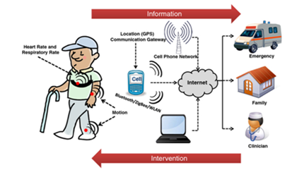 A growing need for wearable sensor networks, and wearable health monitoring systems is the ability to accurately identify and classify the action of the wearer based upon the combination of joint motions and sensor signals.11 This is known as the activity recognition, where methodology similar to that of the Hidden Markov Model (HMM) is used to identify the future unknown actions of a person based upon a number of known parameters.12,13 Activity recognition has an enormous potential in WSNs used for health or motion detection purposes. Activity recognition is the basis for more advanced applications such as advanced embedded decision support, which would allow a WHMS to perform proper statistical and intelligent processing of multiple bio-signals. This processing of signals can be referenced against a series of pre-defined “medical rules” that could lead to on-site incident detection. Activity recognitions currently being analyzed in the context of fall recognition for the elderly.2 Due to advancements in medicine, the average human life expectancy has been on the rise.5 Activity monitoring and fall prevention are two significant concerns for the world’s elderly population. In order to retain the independence and well-being of elderly people, systems such as the one described by Freitas et al.,5 are being developed to allow elderly people to live independent lives, but still allow them to receive immediate care in the event of a fall.5 Freitas et al.,5 describes the development of a WHMS with a single IMU capable of monitoring the user’s kinematics for fall detection.5