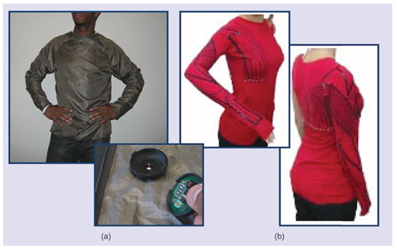 Figure 5 “Examples of e-textile technologies developed over the past ten years. (A) A system developed by Wade and Asada relying upon special buttons that carry sensor technology to record physiological and movement data. (B) A system developed by De Rossi’s research team for monitoring the movements of the shoulder and elbow via recordings of the voltage drop on conductive elastomers that are printed on the garment.”2