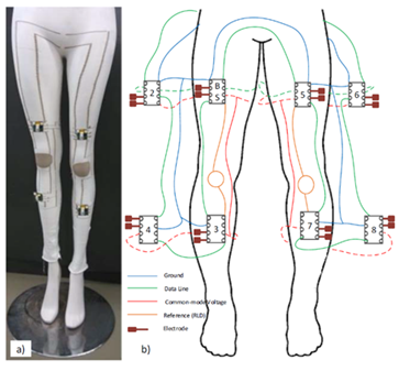 Wearable gait analysis systems are soon going to be of great benefit to the world of professional athletes as there has long been a need for wearable sensors to analyze physical performance characteristics, especially in the context of injury recovery. When an athlete or sports player is injured, they must take time off from their sport or training to allow their body to heal. Athletes and sports players are incentivized to go back to work as soon as possible after an injury, but if their injury has not fully healed, the likelihood of them being re-injured is greatly increased. For this reason, wearable sensors are needed to give professionals accurate information regarding the status of an injury, and can give a quantitative value to injury recovery progression. One such system is being developed specifically such that it can be worn underwater for use in hidrocinesiotherapy will be capable of measuring posture, heart rate, respiratory rate, and subject temperature.9 According to Rocha et al.,9 their sensor is expected to be accurate to within three degrees, however little is mentioned in regard to specifics in how the system will achieve these goals.9 The article notes that only one sensor module was used in testing to demonstrate the feasibility of their system.9 Another issue with the system described in9 is that their motion detection fails when given purely rotation over the magnetic field vector (earth’s magnetic field vector) meaning if the IMU is rotated while stationary, the IMU will fail to keep track of this motion, and the system may need to be recalibrated. E-textiles are being researched and developed with expectations to incorporate these sensors into fabrics that can be worn instead of attached.2,7 The Life Shirt from Vinometrics, and the Smart Shirt from Sensate are both currently available products which utilize conductive materials and fabrics to record data in a comfortable and non-intrusive manner.24 The flexible wearable sensor network (WeaSN) contains IMU sensors and electrodes that are sewn into the material with conductive fibers as shown in Figure 5.8 This WSN is equipped with both (sEMG) and (ECG) measuring electrodes, as well as IMUs.8 The sensors transmit the data through the conductive yarn traces to a Central Processing Module (CPM), and from there is then sent via Bluetooth link to the user’s phone or computer.8 Conductive yarn is used instead of traditional wires as user comfort is an important requirement forany body-worn WSN. It is not known however if such a system can be easily made to cope with issues such as conductive moisture contacting the sensors/data transmission fibers. The exposed nature of conductive fibers means that the integrity of the data signal may be compromised if the subject wearing the system comes in contact any conductive material, the most likely being rain water or sweat. Additional examples of e-textile systems under development can be seen in Figure 6.2 Flexible wired and wireless sensors are being developed that can change their resistance in association to the amount of stretching the material undergoes.7 Flatau et al.,25 refers to these sensors as Smart Fabric Sensors (SFS’s) and defines them as “fabrics which are imbued with sensing properties”.25 SFS’s are a more generalized category of what are called Smart Fabric Transducers (SFT’s) which are fabrics that have been treated or modified in such a way that they are sensitive to temperature changes, electrical current, pressure, or force, all while remaining a flexible and form-fitting for a potential user.25 Flatau et al.,25 also discusses how SFT’s can be used as power generators for harvesting energy from the user to prolong the life of a WSN, or as an actuator to assist the motion of a user.25