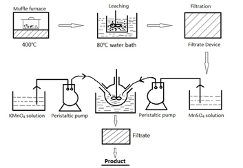 The preparation of the honeycomb-like structure MnO2: A certain amount of KMnO4 solution and the MnSO4 solution were feed into three necks flask by a peristaltic bump, and the flask was put in a 80°C water bath. The honeycomb-like structure MnO2 product was obtained by washing, filtrating and drying at 80°C in drying oven. The crystal structure and the morphology was characterized by X-ray diffraction and Scanning Electron Microscopy. The Schematic diagram of the preparing process for honeycomb-like MnO is shown in Figure 1.