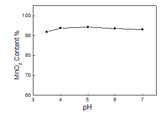 The flask with three necks was put into water bath with 60°C constant temperature. MnSO4 solution was adjusted to the different pH value of 3, 4,5,6,7 by adding NaOH particle, and then MnSO4 and KMnO4 solution with the mole ratio of 3:2 were added into flask at the same speed of 3ml/min. The MnO2 content of the precipitate was shown in Figure 2. When the pH value of MnSO4 solution was increased to be 5, MnO2 content of the product can be reached to be 94.24%. When the reduced MnO2 ore was leached by dilute sulfuric acid to be MnSO4, other impurity ions such as Fe2+, Al3+ and Zn2+ was solved. Some ions was precipitated if pH value of MnSO4 solution was increased to be 5, so the purity MnO2 product was improved. When pH value of MnSO4 solution was improved to be over 6, the precipitated Al(OH)3 was dissolved again in the MnSO4 solution, resulting in the decrease of the purity MnO2 product.