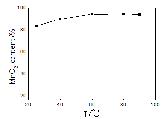 The pH value of MnSO4 solution was adjusted to be 5 by adding NaOH particle. The flask with three necks was put into water bath with the different temperature and then MnSO4 and KMnO4 solution with the mole ratio of 3:2 were added into flask at the same speed of 3ml/min. The MnO2 content of the precipitate was shown in Figure 3. With the increase of water bath temperature, the purity of the MnO2 product was improved gradually. When the reaction temperature ranged from 60°C to 90°C, the purity of MnO2 product was increased from 94.24% to be 94.3%. At the relative high reaction temperature, the rate of chemical reaction was accelerated. However, in consideration of water evaporation at 90°C, the temperature of water bath was controlled at 60°C.