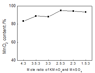 The pH value of MnSO4 solution was adjusted to be 5 by adding NaOH particle. The flask with three necks was put into water bath with 60°C and then MnSO4 and KMnO4 solution with the different mole ratio were separately added into flask at the same speed of 3ml/min. The MnO2 content of the precipitate was shown in Figure 4. With the decrease of mole ratio of KMnO4 and MnSO4, the content of the product raised at first and then descended. The optimal mole ratio of KMnO4 and MnSO4 is 2.5:3, and the purity of MnO2 is 95.01%.