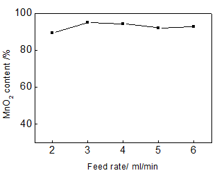 The pH value of MnSO4 solution was adjusted to be 5 by adding NaOH particle. The flask with three necks was put into water bath with 60 °C and then KMnO4 and MnSO4 solution with the mole ratio of 2.5:3 were added into flask at the different speed of 2,3,4,5,6ml/min. The MnO2 content of the precipitate was shown in Figure 5. With the increase of MnSO4 and KMnO4 solution feed rate, the purity of MnO2 product was decreased. When the feed rate was improved to be over 5, the purity of MnO2 product was decreased slowly. When the feed rate was relative fast, partial solution of MnSO4 and KMnO4 did not occur redox reaction which causing the decrease of MnO2 precipitation and the content of the impurity in product was relative high. So the feed rate 3ml/min of MnSO4 and KMnO4 solution was recommended.