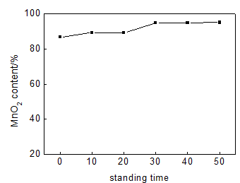 The pH value of MnSO4 solution was adjusted to be 5 by adding NaOH particle. The flask with three necks was put into water bath with 60°C and then MnSO4 and KMnO4 solution with the different mole ratio of 3:2.5 were added into flask at the speed of 3ml/min. When the feed of MnSO4 and KMnO4 solution was finished, the mixed solution in the flask with three necks was standed for 0, 10, 20, 30, 40, 50min. The MnO2 content of the precipitate was shown in Figure 6. The effect of the stand time on the purity of the product is negligible; the redox reaction of MnSO4 and KMnO4 was finished with the completion of feed. So the stand time of 30min is enough.