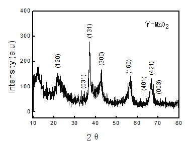 The crystal phase of the honeycomb-like structure MnO2 was analyzed by powder X-ray diffraction. The XRD patterns of the representative a product was shown in Figure 7, it corresponded to the formation of γ-MnO2 (ICDD-JCPDS No. 14-0644). Meanwhile, the broadened diffraction peaks indicated that the crystalline sizes of the samples was small, further verifying the high crystallinity of the MnO product.