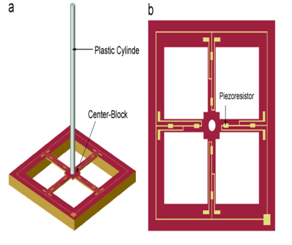 According to the auditory principle of lateral line organ, we can see that the mechanoreceptor structure is the stereocilia which acts as sensors for flow noise by stimulating the hair cell. Therefore, the bionic structure mainly includes the design of hair cell and its stereocilia. In this paper, the piezoresistor is simulated to hair cell and the rigid plastic cylinder is simulated to stereocilia. The structure of hydrophone consists of two parts: fourbeam microstructure and rigid plastic cylinder which has the same density as that of water. Figure 2 shows the actual design of this structure. Figure 2A is the three-dimensional (3D) model of the design and Figure 2B gives the two dimensional (2D) top view of the design. The four-beam microstructure consists of four vertical cantilever beams. The rigid plastic cylinder is fixed at the center block of the four-beam microstructure. Both the center block and the beams have the same thickness. The whole structure has complete axial symmetry in the xoz plane and yoz planes. According to acoustics theory, only when the cylinder and the surrounding medium have the same density can the cylinder and the medium particle have synchronous vibration, or else the acoustic information cannot be exactly memorized. In this paper, the rigid plastic cylinder not only has the same density as that of water but also has small geometric size (diameter: 200mm, length: 5000mm), meeting the vibration conditions well.