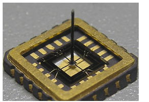 The metal layer has been patterned by photolithography and etched to define the metal tracks. The cantilevers in the device layer have been etched in an inductively coupled plasma (ICP) reactor after the SiO2 passivation layer has been removed and the 2 mm thick buried oxide has been subsequently removed. In the last step, the wafer has been aligned on the backside and the structures have been released by ICP process, and then the buried oxide layer has been removed by a dry etch step. The SEM image (top view) of the microstructure is shown in Figure 3. After the four-beam microstructure is fabricated, a rigid plastic cylinder is fixed at the center of the microstructure as shown in Figure 4, and then packaged in a hat which is made of sound-transparent polychloroprene rubber. A built-in high-quality, low noise, 50 dB preamplifier provides signal conditioning for transmission over long underwater cables. An integrated waterproof rubber ring allows quick disconnection of the cable and makes replacements and storage very easy. In order to make the motion of the rigid plastic cylinder be the same as that of the acoustic medium particle, castor oil that has the same density as that of water is poured into the hat and low-noise cable is led out.