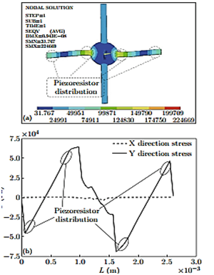 obtain a maximum sensitivity, the piezo resistor cannot be placed in the maximum stress area and the nonlinear area. The stress of the MEMS hydrophone was analyzed using ANSYS where 1 Pa loads were added along the Y direction of the rigid cylinder and Z direction to the cantilever beam. The stress-contour of the structures are shown in Figures 5A & Figure 6A, whereas, the stress curves of one beam obtained by path definition in ANSYS are shown in Figures 5B & Figure 6B. According to the piezo resistor distribution principle, the simulation piezo resistor distribution graph was marked in Figures 5B & Figure 6B, where there were about 100μm from the end of cross-beam and 200μm from the roots of silicon cantilever. Moreover, the transverse stress of cross-beam X direction was approximated to zero in symmetrical distribution as shown in Figures 5 & Figure 6.