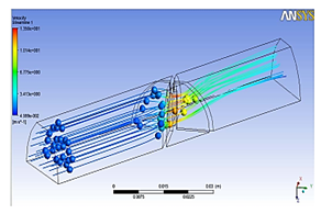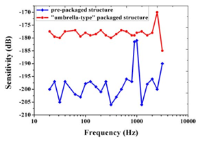 Figure 7 illustrates the cohesive energy model of “umbrella-type” packaged structure by ANSYS. It can be seen that the particle velocity is obviously much larger at the location closer to the optical fiber cylinder than that of the locations away from the optical fiber cylinder, which is agreement with the theoretical analysis. We extract the acoustic pressure at point A (inside the cap) with pre-packaged structure and “umbrella-type” packaged structure respectively in LMS virtual Lab acoustic. The sensitivity test adopts a standing wave comparison calibration, i.e., the open-circuit voltage output of the tested MEMS hydrophone is compared with the reference hydrophone to determine the sensitivity of the tested hydrophone. Figure 8 depicts the frequency response of the pre-packaged hydrophone and “umbrella”-type packaged hydrophone. It can be seen that the receiving sensitivity of the “umbrella”-type packaged hydrophone reaches - 178dB (0 dB reference 1V/μPa), increased by 20 dB comparing with the pre-packaged hydrophone, and that the frequency band ranges from 20 Hz to 2 KHz (broaden one times).More importantly, the fluctuation of the curve is within ±2dB (decreased by ±3 dB).