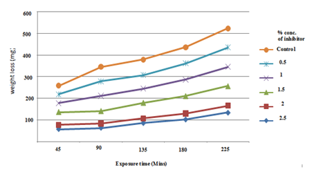 The weight loss data is presented as a chart in Figure 3. It can be seen that the weight loss for the sample without inhibitor was highest at each point in time. The weight loss however decreased with addition of inhibitor. It can be seen also that as the inhibitor concentration gets to 2.0% the weight loss was only 0.14g at 225mins. Additional concentration gave no significant difference in weight loss. This perhaps is because, at that concentration, adequate inhibitive film barrier for corrosion protection was achieved.