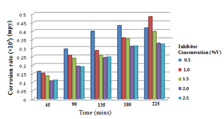 The result from corrosion rate test is displayed in Figure 4. It is evident that the corrosion rate decreased at each point in time with increasing concentration of inhibitor up till 2.0%. Beyond 2.0%, there was no significant difference in the corrosion rate. This could be attributed to the fact that adequate inhibitive film barrier for corrosion protection was achieved at 2.0% concentration of inhibitor and further addition of inhibitor would not be necessary.
