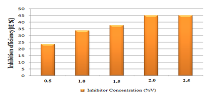Figure 5 shows the inhibition efficiency of the various inhibitor concentrations used for the weight loss test. From the chart, it can be inferred that the highest inhibition efficiency of 45% was achieved at 2.0% concentration of inhibitor. This shows that the oxide films formed on the carbon steel surface at that concentration were thick and stable enough to diminish corrosion rate due to the passivation influence of the inhibitor. Further increase in inhibitor concentration gave no notable increase in efficiency.