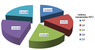 Visual inspection is a Non Destructive Evaluation method for corrosion monitoring. It is the simplest and the oldest inspection technique.13 Although this technique has some limitations, it is however the first approach in corrosion inspection. The visual observation of coupons (without and with inhibitor) after 5hr of exposure reveals changes in color of the coupons from bright shiny surfaces to dull ones. Pits were observed on the samples as indications of corrosion attack by the acidic media. However, the changes in color as well as the presence of pits were more intense with the solutions without inhibitor. It decreased with increasing concentration of inhibitor up to 2.0% and then changes insignificantly.