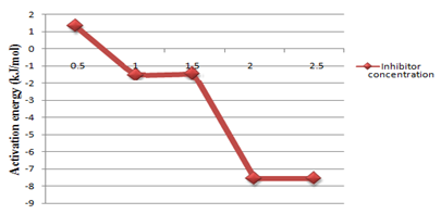 Activation energy (E) for mild steel in deaerated saline solution in the presence and in the absence of the inhibitor was calculated and result displayed in Figure 7 below. The activation energy at different concentration of the inhibitor is plotted. Values for inhibited systems reduce with increase in inhibitor concentration, indicating that the inhibitor exhibit high inhibition tendency. However, this trend discontinued at 2.0%, with the activation energy remaining at -7.562kJ/mol, owing to the fact that the optimum concentration has been reached.