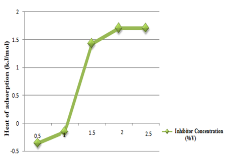 Figure 8 below shows the result for heat of adsorption. The values increase up to 1.703kJ/mol. This is an indication that the adsorption of inhibitor molecules is chemisorptions. It is a chemical reaction between the carbon steel surface and the inhibitor, generating new bonds at the adsorbent surface thereby shielding it from further corrosion. The values however did not increase at concentrations above 2.0%, suggesting that the optimum concentration may have been reached.