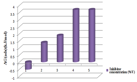 The result for free energy (∆G) at various concentration of inhibitor is shown in Figure 9 below. The values increase from -0.521kJ/mol at 0.5% inhibitor concentration, up to 3.690 kJ/mol, at 2.0% inhibitor concentration. The positive values suggest strong impediment in the spontaneity of the corrosion reaction and the high values indicate that the corrosion reaction on the carbon steel surface is reduced by the inhibitor. The increased trend of free energy (∆G) values however discontinued from 2.0% inhibitor concentration. This suggests that the optimum concentration of inhibitor may have been achieved.