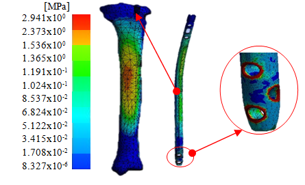 To this bone-nail system, a numerical simulation is applied through the ANSYS® computer program, academic version 18.13. To carry out this study, a structural analysis is considered where a high-order element (Solid brick 186, 20 nodes and 6 degrees of freedom) is used, this type of element has proved to be the most convenient to be applied to three-dimensional pieces or objects. The size of the discretized model has thin elements smaller than 1mm, resulting in 54,875 nodes and 26,651 elements from the whole bone system. A linear-elastic analysis is considered, with a Modulus of Elasticity 104 GPa and Poisson's ratio of 0.33. The loading external agent depends on the position of the foot, for this study it was carried out considering a total anchorage of movements at the tibial plateau of the bone and in the interior malleolus a force of 25kg is applied.