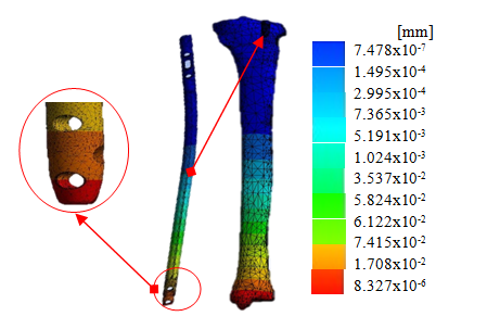 Finally, with the development of the analysis it can be observed the mechanical behavior that presents the nail within the system, under compression conditions. In the Figures 2&3 it is possible to see the maximum stress generated, as well as the maximum elongation of the bone-nail system.2,3
