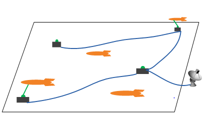 The problem to solve is to surveillance an area with a swarm of underwater robots. Marine biologists want to know if a specific kind of marine animal exists in the AOI, so a swarm of underwater robots is deployed. The underwater robot swarm should report the existence of the animal, and also follow it to take videos. As discussed in section introduction, currently we do not have underwater communication device that is fast, reliable and long in communication range. However, communication between underwater robot and communication nodes has been tested successfully. So in our swarm, we abandon direct communication between a pair of underwater robots, but underwater robots can communicate with the communication nodes through optical communication method when a robot is visiting the communication nodes. As the swarm do not share real time communication, each robot need to make decision by itself, instead of waiting for command from the control center or a leader robot. This means we need to develop a distributed control strategy. We assume that a set of underwater communication nodes has been pre-deployed in the AOI, and these nodes are connected with underwater cable, making them a network that can share data real-time. The control center is connected with the underwater communication network, so that it can only get updated information when robots visiting communication nodes. The whole scenario is shown in Figure 1.