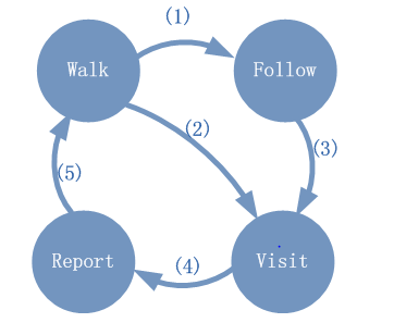 The behavior law for each robot can be represented as a finite state machine, showing in Figure 2. The finite state machine contains four states, namely walk, follow, visit and report.