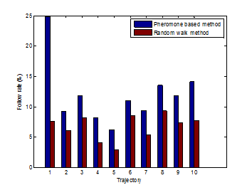 is the total simulation time as 2000. This metric indicates how long the target has been followed by the swarm, also how much data has been collected. The performances of two methods are compared in the simulation experiment. One is the Pheromone based method proposed in this paper, and the other is the random search method. The random search method is a basic search strategy. In Walk state, a robot will choose its navigation direction randomly instead of according to the Pheromone density. To compare the performance of the two methods, we randomly generate 10 sets of trajectories for the target. For each trajectory, both the Pheromone based method and the random search method are repeated for 10 times. The experiment results are shown in Figure 3.