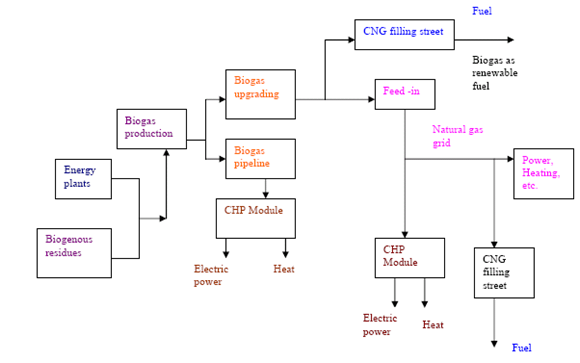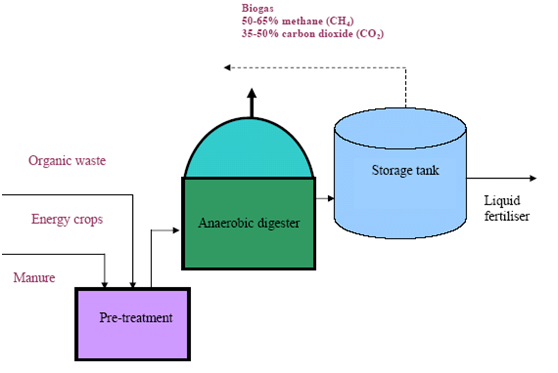 The importance and role of biogases in energy production is growing. Nowadays, a lot of countries in Europe promote utilisation of renewable energies by guaranteed refund prices or emission trading systems. A general schematic of an agricultural biogas plant, with the anaerobic digester at the ‘heart’ of it as shown in Figure 2. Pre-treatment steps (e.g., chopping, grinding, mixing or hygienisation) depend on the origination of the raw materials. In the past two decades the world has become increasingly aware of the depletion of fossil fuel reserves and the indications of climatic changes based on carbon dioxide emissions. Therefore extending the use of renewable resources, efficient energy production and the reduction of energy consumption are the main goals to reach a sustainable energy supply. Renewable energy sources include water and wind power, solar and geothermal energy, as well as energy from biomass. The technical achievability and the actual usage of these energy sources are different around Europe, but biomass is seen to have a great potential in many of them. An efficient method for the conversion of biomass to energy is the production of biogas by microbial degradation of organic matter under the absence of oxygen (anaerobic digestion). It is now possible to produce biogas at rural installation, upgrade it to bio-methane, feed it into the gas grid, use it in a heat demand-controlled CHP and to receive revenues. Biogas is a mixture containing predominantly methane (50-65% by volume) and carbon dioxide and in a natural setting it is formed in swamps and anaerobic sediments, etc., due to its high methane concentration, biogas is a valuable fuel. Wet (40-95%) organic materials with low lignin and cellulose content are generally suitable for anaerobic digestion (Figure 3).