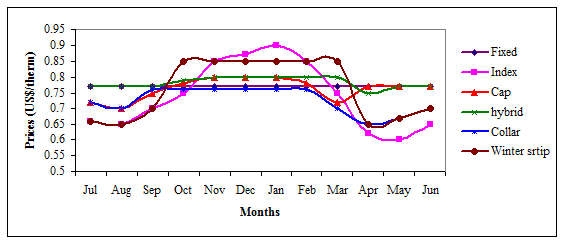 Financial hedges (such as futures and options) are contractual vehicles that convey rights and obligations to buy or sell a commodity at a specified price. Possible purchasing strategies using hedges are summarised in Table 10. These financial derivations are a method of reducing price risk with a relatively modest transaction price. Over the past 10 years the use of financial hedges has grown dramatically. Figure 7 illustrates various hypothetical reduction strategies and the resulting average fuel price. The basic concept is to utilise existing financial tools to guard against conditions that will negatively affect the operating budget. Basic hedges include: