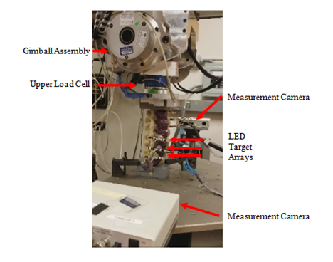 The synthetic spine model was mounted in a robotic testing platform26 that had four programmable degrees of freedom with a positional resolution of 2 µm in x, 0.31µm in z, and 0.0002° about y (Figure 2). An upper load cell (ULC) (JR3 Inc., Woodland, CA) with 400N load and 40Nm moment capacities was attached to the gimbal assembly and measured the forces and moment applied to the spine model at a rate of 15Hz. The spine model was tested under a pure moment and an axial load of 20N was applied to the spine27 and rotated between 25° flexion and 10° extension at 1.6°/s. Motion in either direction was stopped if the moment limit exceeded 10Nm. The axial load was applied through the global point of rotation of the entire spine model (i.e., point of rotation of T12 relative to the sacrum). This step minimized any off-axis bending moment from being created by the axial load. The control strategy has been validated and used in other biomechanical studies.15,27–29