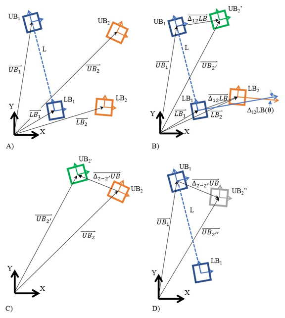 Figure 3 Method for determining the local IAR of upper body (UB) relative to the lower body (LB). A) UB1 is a known location of Upper Body at time 1, UB2 is a known location of Upper Body at time 2, LB1 is a known location of Lower Body at time 1, LB2 is a known location of Lower Body at time 2, B) UB2’ is a calculated location of Upper Body at time 2 due to the motion of Lower Body alone, C) The relative change of the UB between UB2’ and the final position UB2 is given by Δ2-2’UB, and D) UB2’’ is a calculated location of Upper Body at time 2 due the motion of Upper Body alone relative to a stationary LB.