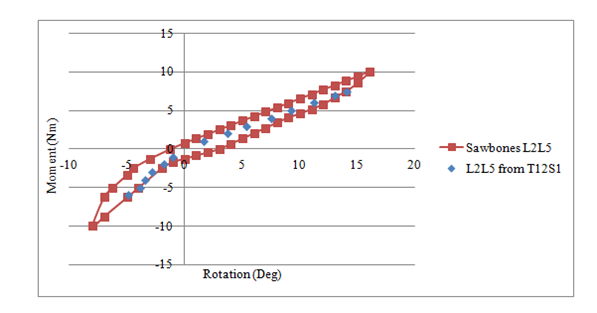 Figure 4 Comparison of Moment-Rotation Stiffness Properties between L2-L5 Sawbone’s Inc. Model12 and Segments L2-L5 of the New Untested Full-length (T12-Sacrum) Model.