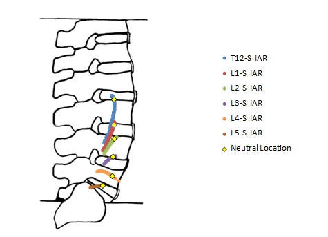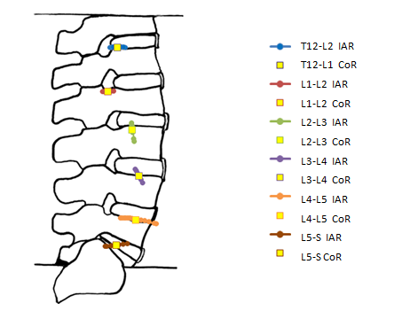 The local IAR path of each vertebral body relative to its subjacent body is shown in Figure 8. For all MSUs, the local IAR paths were generally located along the superior endplate surface of the lower body. The local IAR of the upper two MSU (T12-L1 and L1-L2) was near the posterior wall of the endplate surface while the local IAR locations of the remaining vertebrae were closer the midline of the end plate surface of the lower vertebral body. The profile of each MSU path is largely dictated by the mechanical properties of the interconnecting vertebral disc material and pseudo-ligament structures. The CoR values of each MSU are also shown on Figure 8 and were located near the mid-point of their respective IAR path. For those MSU with their CoR located near the midline of the vertebral disc, involvement of the facet joints was likely minimal.