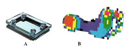 Figure 1 Measuring equipment for dynamic data capture: A-force platform (Kistler) for measurement e.g. of take-off in jumps, B-multisensor insole (Emed) for measurement of distribution of load acting on foot.