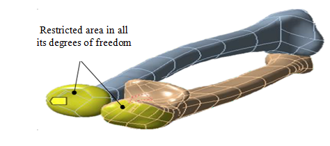 Considering that this type of analysis is a solid, the command 8 node 133 is used so it is called that it is high order.3 This provides the ability to generate more nodes for more accurate analysis. On the other hand, when the discretization of the bones is established it is automatically generated by the program by the irregularities of the surface of the bone tissues (Figure 3).4 To solve this type of analysis itestablishes an analogy between the human body and a machine composed of pulleys and levers. Where a 196.2 N load is considered on the X axis in the distal zone. Based on the characteristics of an individual in Mexico is 74kg, assuming that the position is held statically and that the angle formed between the arm and the elbow is 90°.
