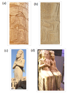 Figure 1 God Amun in standing and sitting positions (a and b) and also pharaoh and pharaoh and his wife in standing and sitting positions (c and d).