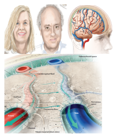 Figure 1(a) (b) (c) Portraits of Maiken Nedergaard and Steven A. Goldman (taken from Ref 2) Glea-lymphc system surround the blood capillary without use another lymph. Both artery and vein in the brain are surrounded by glia cells. Outside the closed blood capillary are those leaky tubes surrounded by all the end feet of Astrocytes glia cells, surrounding both the vein and the Artery.2 That’s why we need 100 billion of Astrocytes glia cells to connect among 10 billion neurons. The authors spent 5 years time over hundreds mice have identified detail chemical molecular mechanism for the cleansing mechanism during the sleep.2
