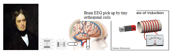 2Faraday Law (Generator: magnetic field move generating the current): the magnetic flux induces the electric motive force that dives the current in a conductor. The pickup of leakage brain magnetic fields are by means of Faraday law of axial currents in mini-coils
