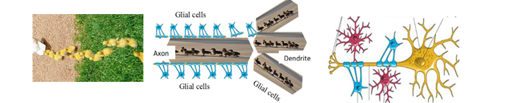 Figure 5 Glia cells surround the output axon to guide Calcium ions current flow within the tube (like 2 charge repulsive ducks(a)) force though the axon tube.(b); in a neuron (c).