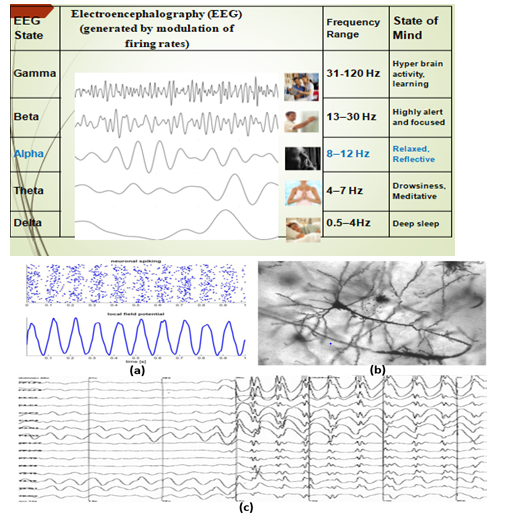 Figure 9 EEG Brainwaves for an Epileptic Seizure Patience: (a) EEG average D,T,A,B waves Low Frequency composition under 30Hz cf. Figure 8; (b) Microscopic functional brain image reveals the neuron axon wire accidently cross backward and touched one the input dendrite tree, that might be the cause generates a feedback stability, Japan Kyushu Institute of Technology Prof. Takeshi Yamakawa et al; have applied the standard laser burning in a drilled hole in the brain scalp to remove the cross-over and turn a month long patient to a week patient; (c) indicating the sudden onset of phase transition of Epileptic seizure, furthermore the high frequency fluctuation might be due to irregular brain toxic production and irregular cleansing by CSF.