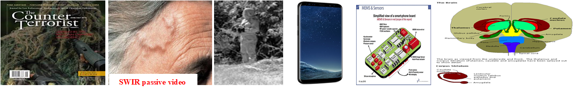 Figure 1 (a) Counter Terrorist Magazine; (b) SWIR facial image; (c) a terrorist with weapon, seeing at night; (d) Smart Phone with build-in sensors on its RHS; (e). Neurobiological finding: Amygdala plays an extensive role in regulating the fear response in humans as well as animals.: “The smaller Amygdala lead to the negative feeling of “self-worthless, hopeless, helpless” when compounded with retarded Hippocampus Associative Memory brain can be easily washed with self-justified terrorism, i.e. illogically commits other massive suicides. Homo sapiens emotion is located at 2 Amygdales (in Latin: Almond shape) in the brain Limbic system that can activate the Sympathetic Nervous System that flood the body with stress hormone. The size of Amygdale is critical to the social skill, responsible for “fight or flight,” and, in the extreme, suicide intention. Thus, we have early derived the brain 4+2 Glial cells, e.g. co-axial insulating outer fatty acids Myelin Sheath making brain order and disorder diagnoses possible; e.g. Einstein smarter; its singularity yields disorders, e.g. Astrocytes Glial for house cleaning Amyloids et al. preventing Alzheimer's, Epileptic Seizure, Multiple Psoriasis. Medical imaging can help using Glial math definition toward an early diagnosis.