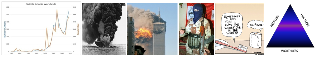 Figure 2 (a) Mass Suicide Terrorism Events increase over time; (b)USS Bunker Hill (CV-17) after a Kamikaze attack by the Imperial Japanese; (c)The World Trade Center in New York City came under a suicide attack on September 11, 2001 (d) Mid-East ST’s were not limited to men, children (e) Cartoons to reach Teenagers.