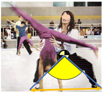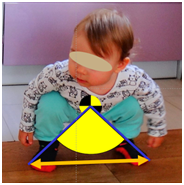 Taking into account mechanical explanation of conservation of balance, a body with greater mass which has larger base and has lower position of center of mass can better maintain balance when is pulled or pushed. As an example there is a position of a coach helping a novice gymnast in executing an exercise. A coach acquires a position with feet far apart and much lowering his or her body. In order to draw an equilibrium angle lines are drawn from the center of mass to the edges of feet. A very good balance maintains also very young baby during a squat position (Figure 1). This gives high value of equilibrium angle (yellow). Trunk is maintained in vertical position. Taking into account feet touching the ground one can draw a line around two feet. The area between the feet including area below the feet is called area of equilibrium. A toddler moves touching all four extremities to the ground, usually hands and knees. In this situation its equilibrium status is very good. In static condition when projection of center of mass moves outside area of equilibrium a person falls down. Some people sitting on a chair make balancing movements forward and backward. This is dangerous situation. Projection of center of mass is near the edge of area of equilibrium. Here the situation happens when projection of center of mass can go outside this area and a person falls down to the rear. Often a head and neck is injured (Figure 2).