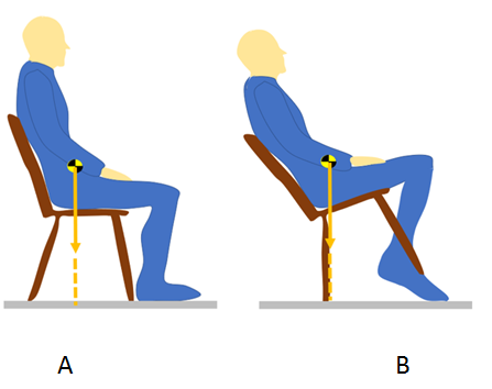 Figure 2 Some people sitting on a chair (A) make balance movements forward and backward (B). When not well controlled an accident happens. It is not recommended to perform such movements.